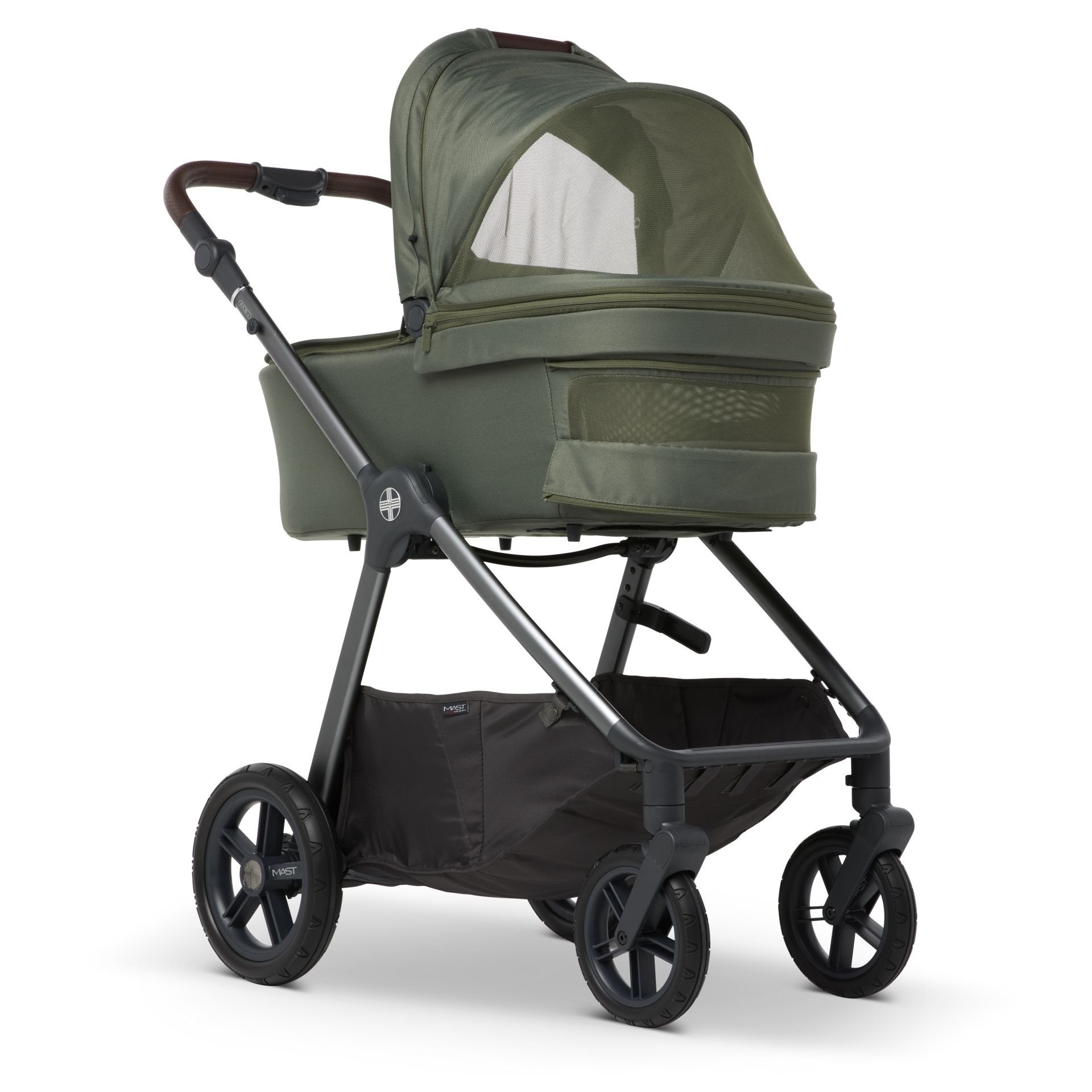 Der Mast M.5x Kombi-Kinderwagen erfüllt all eure Wünsche. Im Lieferumfang enthalten sind die Babywanne, der wendbare Sitz und ein grosszügiger Regenschutz für beide Aufsätze, der auch den Einkaufskorb schützt.