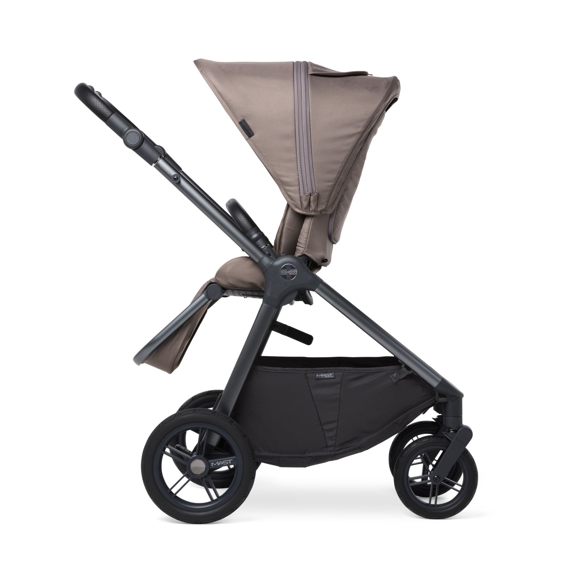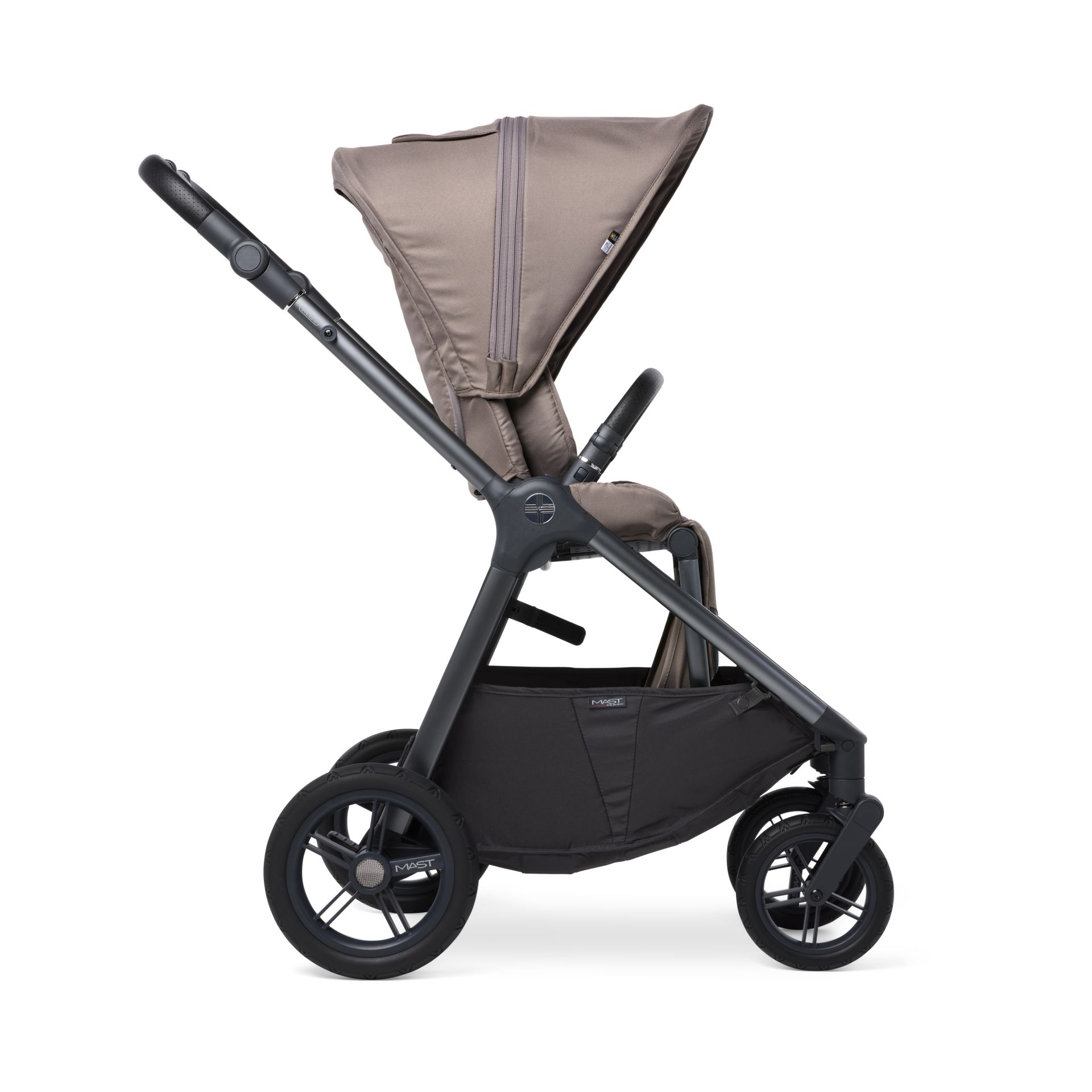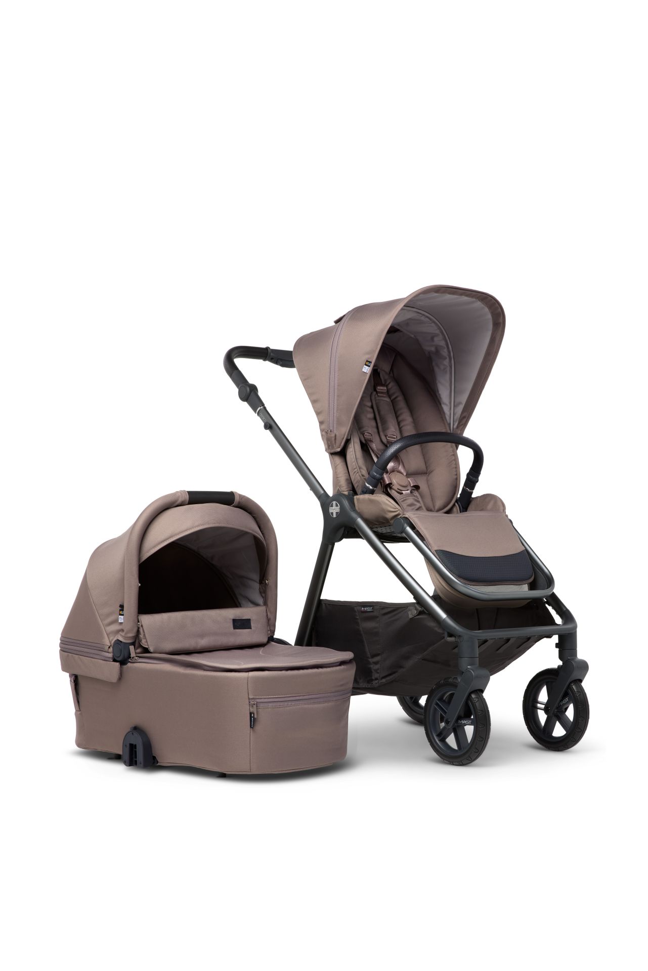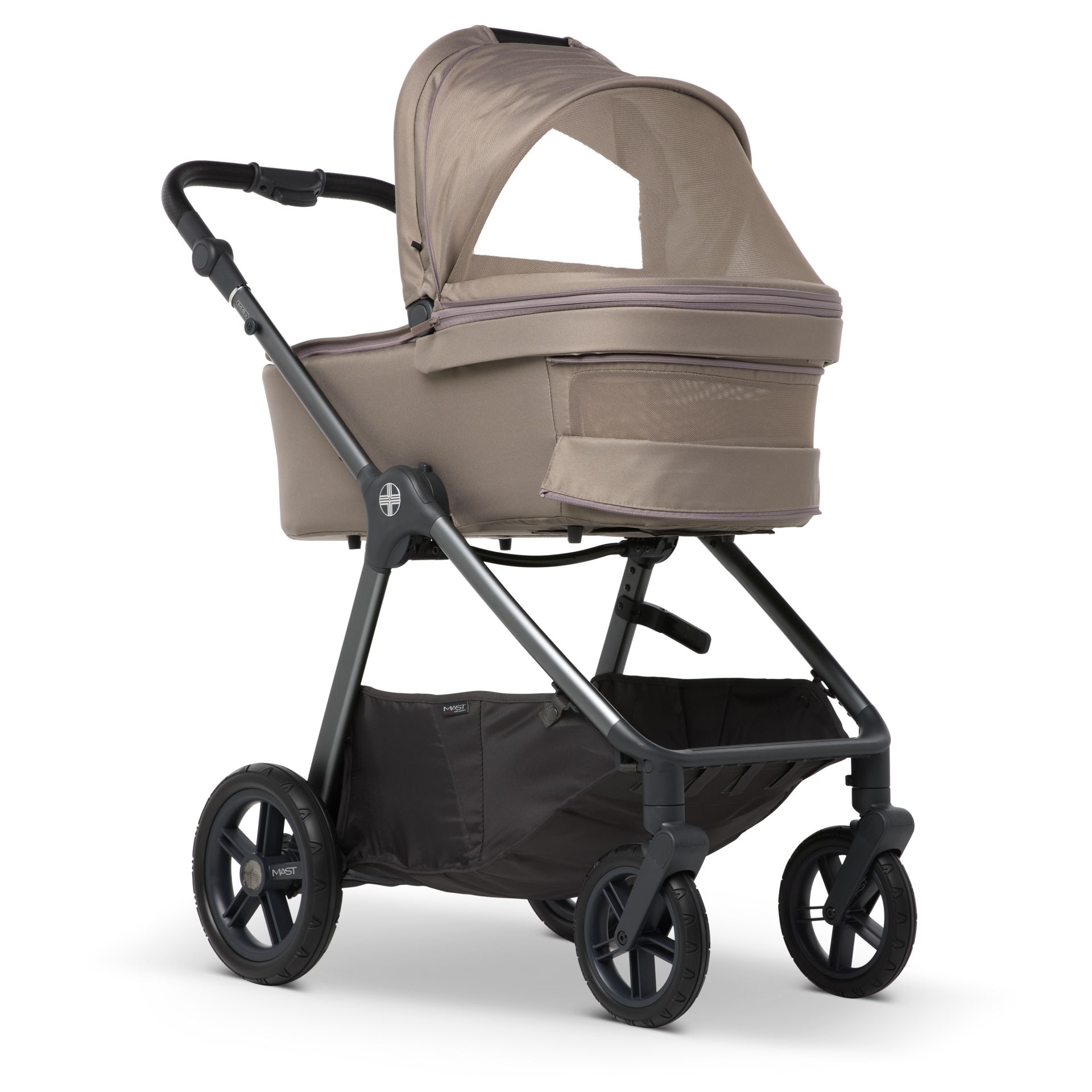Der Mast M.5x Kombi-Kinderwagen erfüllt all eure Wünsche. Im Lieferumfang enthalten sind die Babywanne, der wendbare Sitz und ein grosszügiger Regenschutz für beide Aufsätze, der auch den Einkaufskorb schützt.