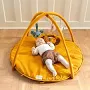 Babykrabbeldecke mit einem freundlichen Tiergesicht, zwei Bögen und hängenden Spielzeugen. Die Bögen können abgenommen werden, sodass die Spielmatte als reine Krabbeldecke/ Spieldecke dient.